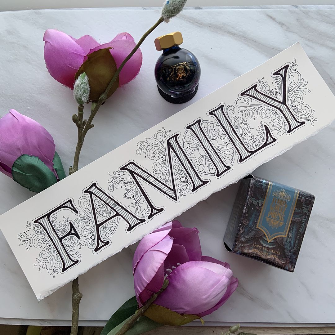 In addition to live events, Valerie enjoys working on private commissions, lettering for invitations, and digital calligraphy. She enjoys teaching pointed pen, cursive handwriting, illumination, engraving and decorative painting. Valerie is a certified American Cursive Handwriting Instructor, in a program created by Master Penman Michael Sull and Marie Hornback. She is also a creative ambassador for Ferris Wheel Press stationery products.